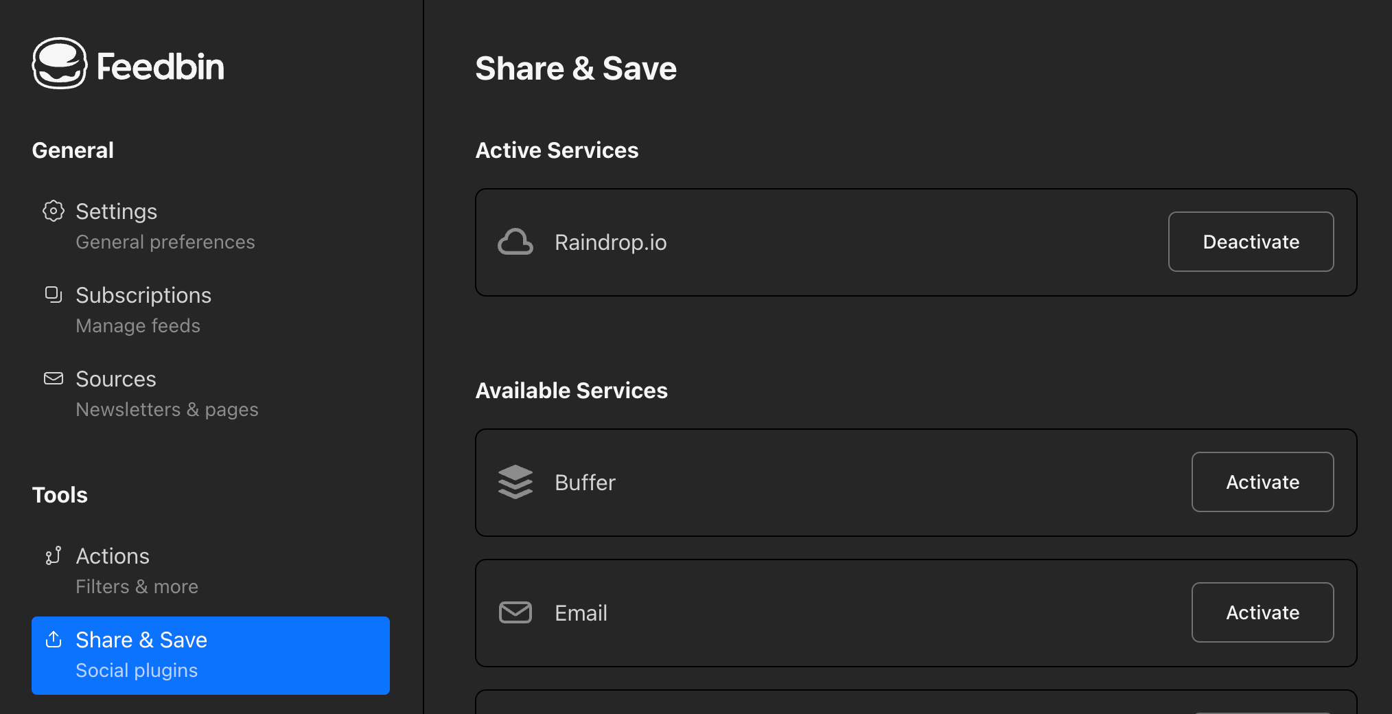 ← All integrationsFeedbinShare to Raindrop.io in one clickAdd Raindrop.io to FeedbinFeedbin is a fast, simple RSS feed reader that delivers a great reading experience.