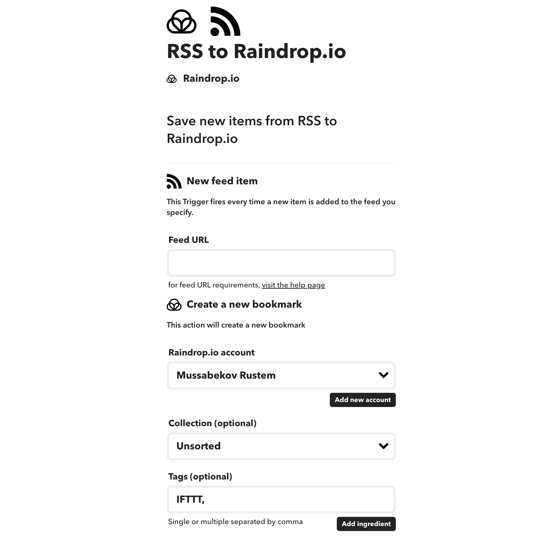 ← All integrationsRSSRead your favorite newsletters in Raindrop.ioAdd RSS FeedIntegration works on IFTTT